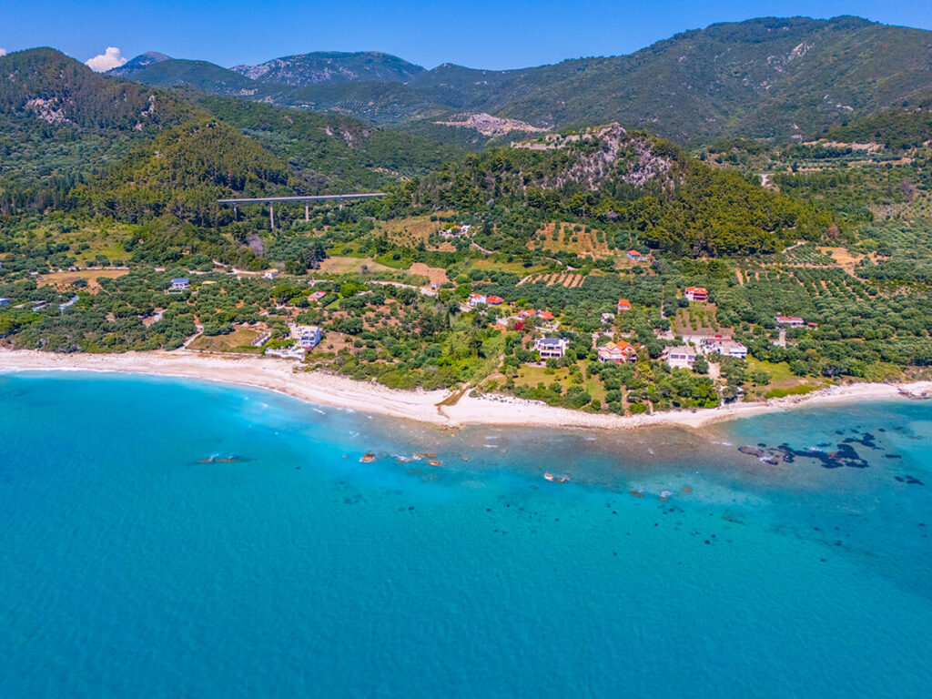 Η παραλία εκτείνεται για περισσότερο από 1 χιλιόμετρο και βρίσκεται ανάμεσα στα παραθαλάσσια θέρετρα Αρτολίθια και Λυγιά. Η ακτή είναι αμμώδης με διάσπαρτα βράχια, ενώ τα νερά της είναι καθαρά και βαθαίνουν ομαλά, καθιστώντας την ιδανική για οικογένειες με μικρά παιδιά. Η παραλία δεν είναι οργανωμένη, οπότε δεν θα βρεις ομπρέλες, ξαπλώστρες ή beach bar. Ωστόσο, υπάρχουν διάσπαρτες μικρές ταβέρνες που προσφέρουν φρέσκο ψάρι και τοπικές γεύσεις.